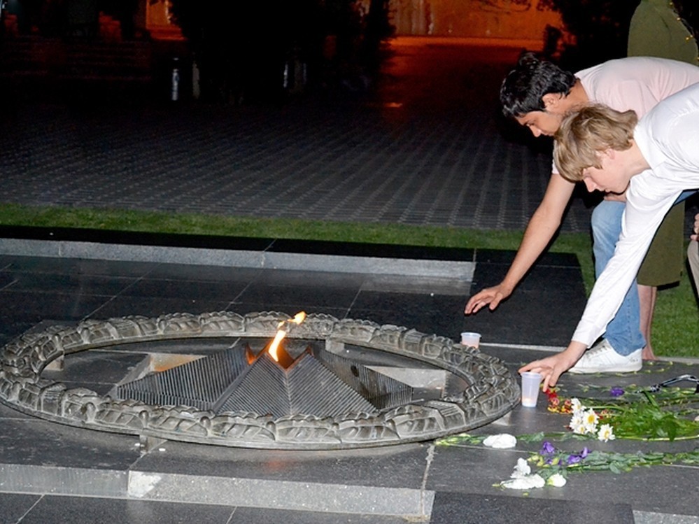 К вечного огню в Братский сад Астрахани прошли молодые энергетики и зажгли свечи в память о героях Великой Отечественной войны.